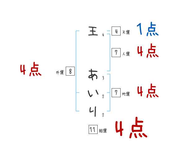 天運![]() | 王あいりさんの天運は4画の1つ星!感情が不安定で苦労するかも。周囲との協調を心掛けましょう。 家系が持つ宿命的な運勢を表します。祖先から受け継いだ苗字ですので自分の力が及びません。家柄を象徴します。 |