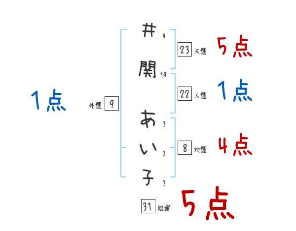 総運![]() | 井関あい子さんの総運は31画の5つ星!社交性があり判断力に優れる。順風満帆な人生で円満な生活。 あなたの人生を表す1番重要な運勢です。生涯を通じて影響する総合運となり、主に50歳以降の晩年期に影響を及ぼします。 |