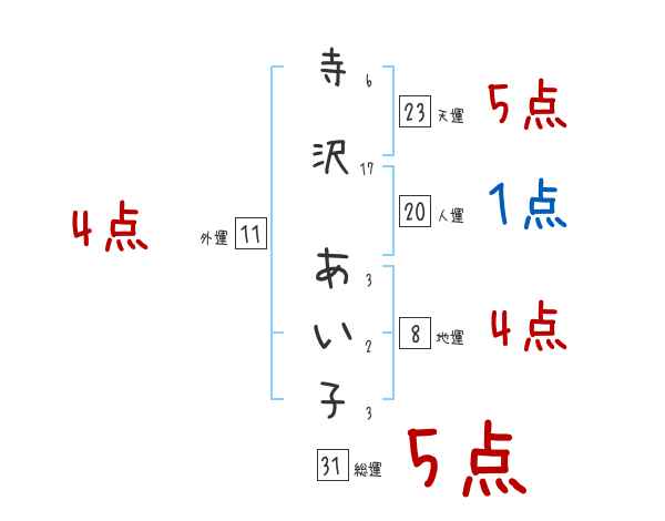 天運![]() | 寺沢あい子さんの天運は23画の5つ星!想像力に優れ活力がある。一代で成功し名誉を手に入れる。 家系が持つ宿命的な運勢を表します。祖先から受け継いだ苗字ですので自分の力が及びません。家柄を象徴します。 |