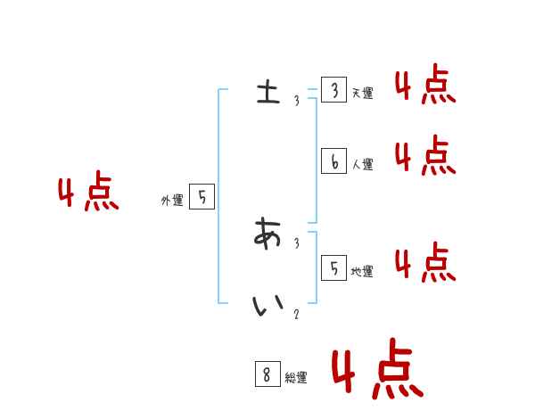 天運![]() | 土あいさんの天運は3画の4つ星!活動的で才能に恵まれ、多くの信頼を得る。希望に満ち成長する。 家系が持つ宿命的な運勢を表します。祖先から受け継いだ苗字ですので自分の力が及びません。家柄を象徴します。 |