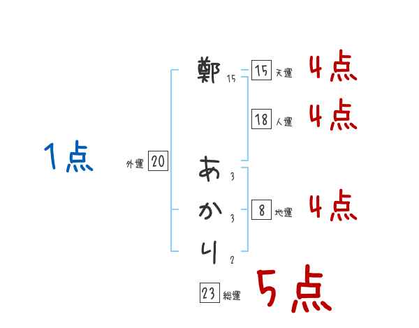 人運![]() | 鄭あかりさんの人運は18画の4つ星!情熱的で剛気。忍耐力があり信頼される。 性格や才能などを表す2番目に重要な運勢です。人間関係や協調性、社会的な成功に影響します。主に20歳から50歳ぐらいまでの中年期の運勢を表します。 |