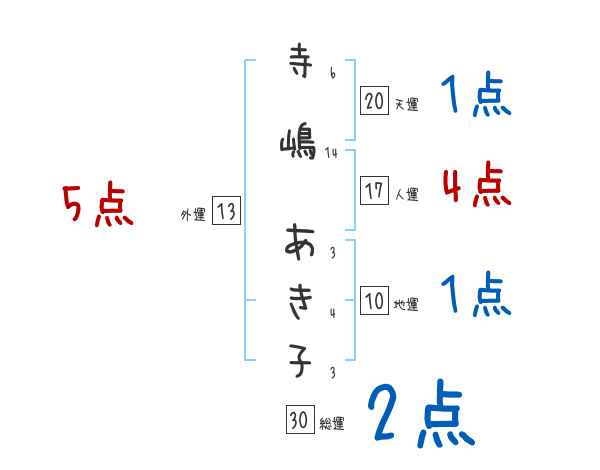 外運![]() | 寺嶋あき子さんの外運は13画の5つ星!才能に恵まれ人気がある。名声を手に入れる。円満な人生。 生活面を象徴する運勢です。外部から受ける影響力を表し、結婚運、家庭運や職場、環境への順応性を表します。 |