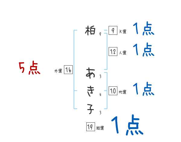 外運![]() | 柏あき子さんの外運は16画の5つ星!人望が厚く大きく発展する。逆転成功が見える。 生活面を象徴する運勢です。外部から受ける影響力を表し、結婚運、家庭運や職場、環境への順応性を表します。 |