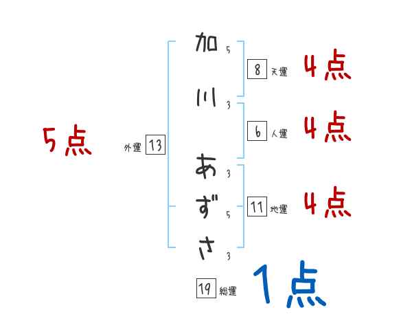 天運![]() | 加川あずささんの天運は8画の4つ星!勤勉家。根気強く努力し成功する。忍耐力がある。 家系が持つ宿命的な運勢を表します。祖先から受け継いだ苗字ですので自分の力が及びません。家柄を象徴します。 |