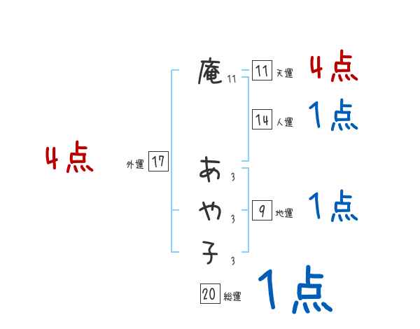 天運![]() | 庵あや子さんの天運は11画の4つ星!着実に富や地位を得る幸運な人生。 家系が持つ宿命的な運勢を表します。祖先から受け継いだ苗字ですので自分の力が及びません。家柄を象徴します。 |