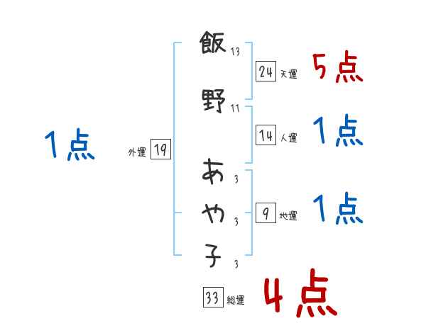天運![]() | 飯野あや子さんの天運は24画の5つ星!家庭運が良く順調な人生。金運にも恵まれる。 家系が持つ宿命的な運勢を表します。祖先から受け継いだ苗字ですので自分の力が及びません。家柄を象徴します。 |