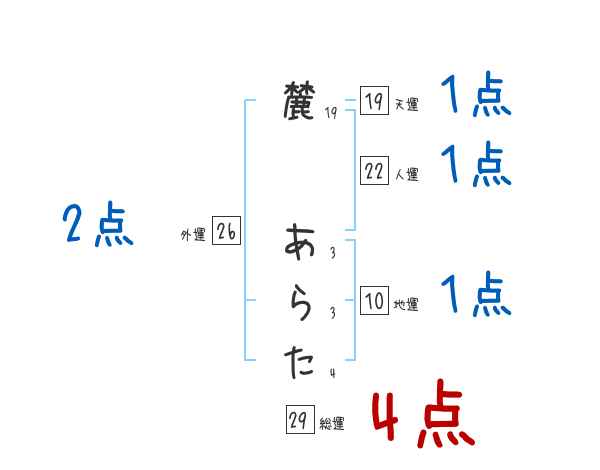 天運![]() | 麓あらたさんの天運は19画の1つ星!優れた才能を持ちますが、協調性が足りないことも。周りの人と協力する事を意識しましょう。 家系が持つ宿命的な運勢を表します。祖先から受け継いだ苗字ですので自分の力が及びません。家柄を象徴します。 |