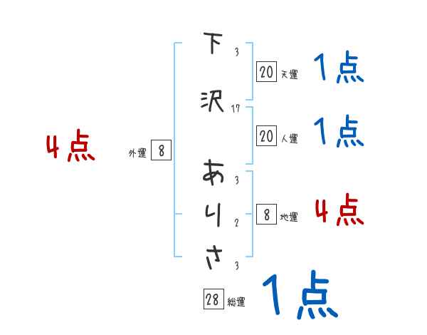 総運![]() | 下沢ありささんの総運は28画の1つ星!家庭環境に注意。スポーツで活躍できる能力があるかも。 あなたの人生を表す1番重要な運勢です。生涯を通じて影響する総合運となり、主に50歳以降の晩年期に影響を及ぼします。 |
