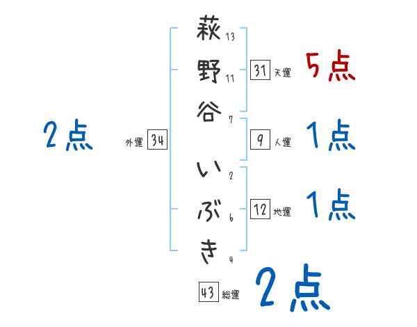 外運![]() | 萩野谷いぶきさんの外運は34画の2つ星!独創性に優れるが、自尊心が強く災難に注意しましょう。 生活面を象徴する運勢です。外部から受ける影響力を表し、結婚運、家庭運や職場、環境への順応性を表します。 |