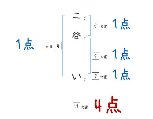 天運![]() | 二谷いさんの天運は9画の1つ星!消極的で才能を発揮することが苦手なことも。周りの意見に耳を傾けましょう。 家系が持つ宿命的な運勢を表します。祖先から受け継いだ苗字ですので自分の力が及びません。家柄を象徴します。 |