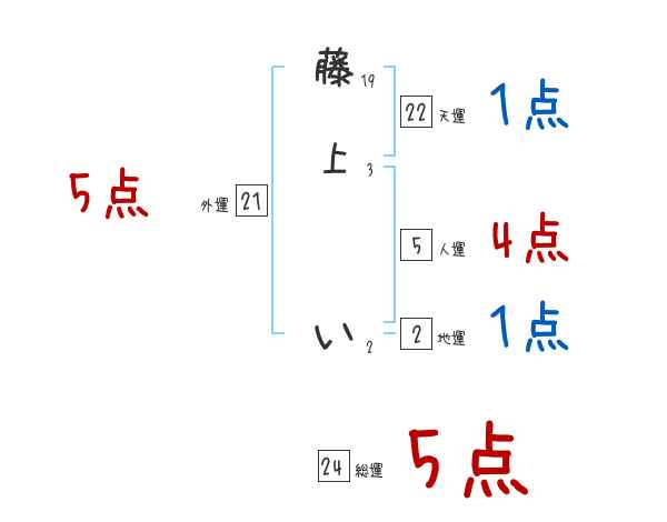 外運![]() | 藤上いさんの外運は21画の5つ星!統率力がある。独立し成功する。名誉を手に入れる。 生活面を象徴する運勢です。外部から受ける影響力を表し、結婚運、家庭運や職場、環境への順応性を表します。 |