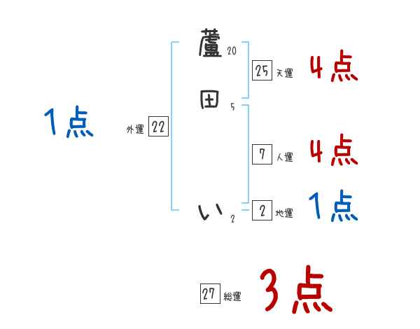 外運![]() | 蘆田いさんの外運は22画の1つ星!努力することが苦手ないっぽう手先が器用。芸術性にも優れる。 生活面を象徴する運勢です。外部から受ける影響力を表し、結婚運、家庭運や職場、環境への順応性を表します。 |