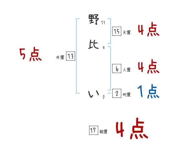 天運![]() | 野比いさんの天運は15画の4つ星!人徳があり出世する。順調に物事を進め円満な人生。 家系が持つ宿命的な運勢を表します。祖先から受け継いだ苗字ですので自分の力が及びません。家柄を象徴します。 |