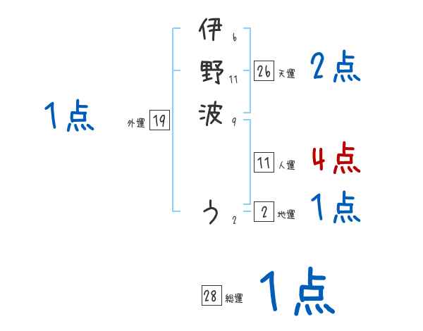 総運![]() | 伊野波うさんの総運は28画の1つ星!家庭環境に注意。スポーツで活躍できる能力があるかも。 あなたの人生を表す1番重要な運勢です。生涯を通じて影響する総合運となり、主に50歳以降の晩年期に影響を及ぼします。 |