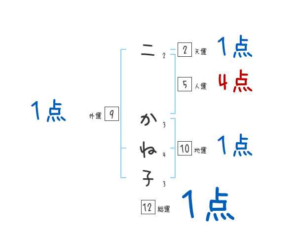 総運![]() | 二かね子さんの総運は12画の1つ星!簡単な失敗で諦めてしまいやすいかも。着実に行動すると良いでしょう。 あなたの人生を表す1番重要な運勢です。生涯を通じて影響する総合運となり、主に50歳以降の晩年期に影響を及ぼします。 |