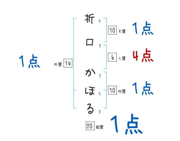 天運![]() | 折口かほるさんの天運は10画の1つ星!不安を感じやすい傾向。ストレスを抱えないように注意しましょう。 家系が持つ宿命的な運勢を表します。祖先から受け継いだ苗字ですので自分の力が及びません。家柄を象徴します。 |