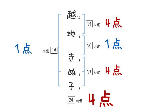 天運![]() | 越地きぬ子さんの天運は18画の4つ星!情熱的で剛気。忍耐力があり信頼される。 家系が持つ宿命的な運勢を表します。祖先から受け継いだ苗字ですので自分の力が及びません。家柄を象徴します。 |