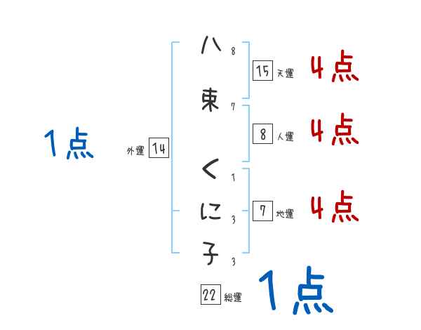 外運![]() | 八束くに子さんの外運は14画の1つ星!人に対して優しいがストレスを溜め込みがち。人間関係のトラブルを避けるよう気をつけましょう。 生活面を象徴する運勢です。外部から受ける影響力を表し、結婚運、家庭運や職場、環境への順応性を表します。 |