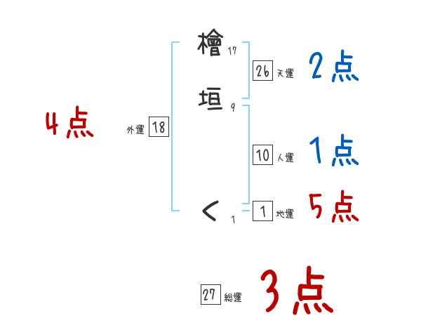 総運![]() | 檜垣くさんの総運は27画の3つ星!頭脳明晰だが強情で摩擦が多い傾向。孤立に注意。 あなたの人生を表す1番重要な運勢です。生涯を通じて影響する総合運となり、主に50歳以降の晩年期に影響を及ぼします。 |
