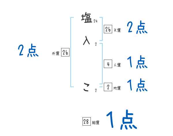 天運![]() | 塩入こさんの天運は26画の2つ星!波瀾万丈かも。信頼できる人を大事にしましょう。 家系が持つ宿命的な運勢を表します。祖先から受け継いだ苗字ですので自分の力が及びません。家柄を象徴します。 |