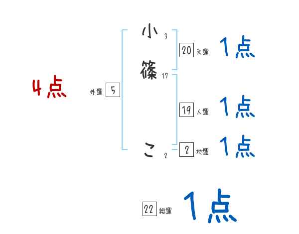 総運![]() | 小篠こさんの総運は22画の1つ星!努力することが苦手ないっぽう手先が器用。芸術性にも優れる。 あなたの人生を表す1番重要な運勢です。生涯を通じて影響する総合運となり、主に50歳以降の晩年期に影響を及ぼします。 |