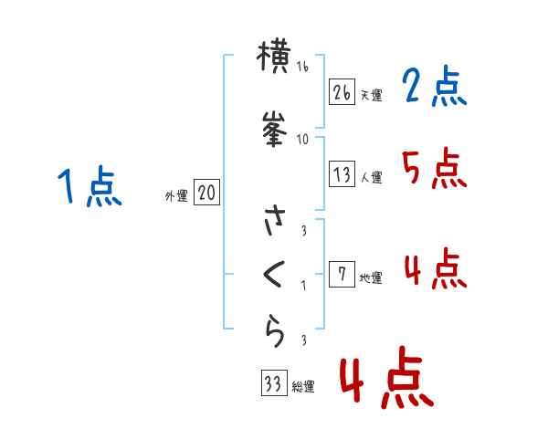 外運![]() | 横峯さくらさんの外運は20画の1つ星!社交が苦手。人とは違った才能があり波乱万丈な人生かも。 生活面を象徴する運勢です。外部から受ける影響力を表し、結婚運、家庭運や職場、環境への順応性を表します。 |