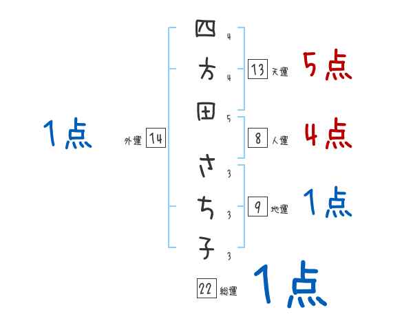 総運![]() | 四方田さち子さんの総運は22画の1つ星!努力することが苦手ないっぽう手先が器用。芸術性にも優れる。 あなたの人生を表す1番重要な運勢です。生涯を通じて影響する総合運となり、主に50歳以降の晩年期に影響を及ぼします。 |