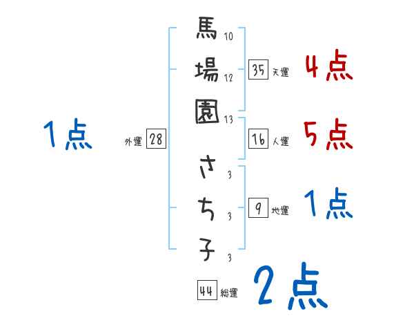 人運![]() | 馬場園さち子さんの人運は16画の5つ星!人望が厚く大きく発展する。逆転成功が見える。 性格や才能などを表す2番目に重要な運勢です。人間関係や協調性、社会的な成功に影響します。主に20歳から50歳ぐらいまでの中年期の運勢を表します。 |