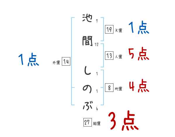 人運![]() | 池間しのぶさんの人運は13画の5つ星!才能に恵まれ人気がある。名声を手に入れる。円満な人生。 性格や才能などを表す2番目に重要な運勢です。人間関係や協調性、社会的な成功に影響します。主に20歳から50歳ぐらいまでの中年期の運勢を表します。 |