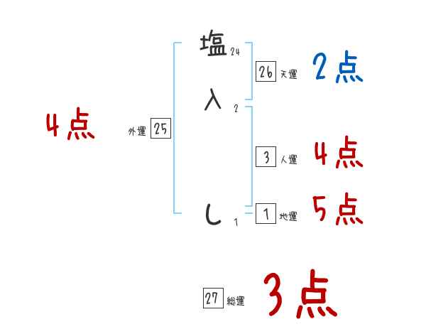 外運![]() | 塩入しさんの外運は25画の4つ星!個性があり才能があふれる。強運の持ち主で発展する。 生活面を象徴する運勢です。外部から受ける影響力を表し、結婚運、家庭運や職場、環境への順応性を表します。 |