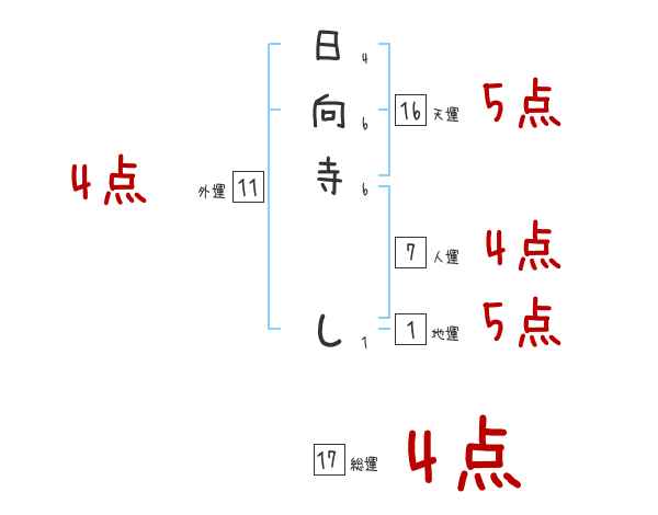 天運![]() | 日向寺しさんの天運は16画の5つ星!人望が厚く大きく発展する。逆転成功が見える。 家系が持つ宿命的な運勢を表します。祖先から受け継いだ苗字ですので自分の力が及びません。家柄を象徴します。 |