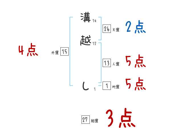 外運![]() | 溝越しさんの外運は15画の4つ星!人徳があり出世する。順調に物事を進め円満な人生。 生活面を象徴する運勢です。外部から受ける影響力を表し、結婚運、家庭運や職場、環境への順応性を表します。 |