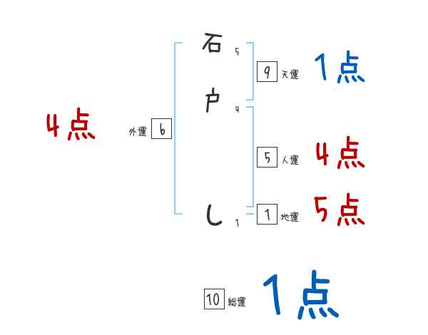 天運![]() | 石戸しさんの天運は9画の1つ星!消極的で才能を発揮することが苦手なことも。周りの意見に耳を傾けましょう。 家系が持つ宿命的な運勢を表します。祖先から受け継いだ苗字ですので自分の力が及びません。家柄を象徴します。 |
