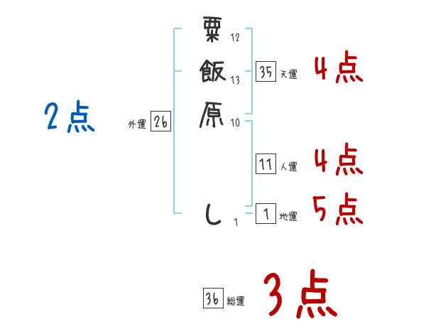 天運![]() | 粟飯原しさんの天運は35画の4つ星!温厚な性格で感受性が高い。穏和な性格で人望が厚い。 家系が持つ宿命的な運勢を表します。祖先から受け継いだ苗字ですので自分の力が及びません。家柄を象徴します。 |