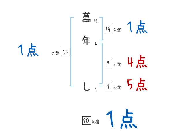 天運![]() | 萬年しさんの天運は19画の1つ星!優れた才能を持ちますが、協調性が足りないことも。周りの人と協力する事を意識しましょう。 家系が持つ宿命的な運勢を表します。祖先から受け継いだ苗字ですので自分の力が及びません。家柄を象徴します。 |