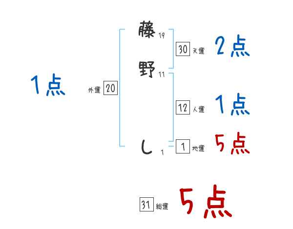天運![]() | 藤野しさんの天運は30画の2つ星!浮き沈みの激しさに注意しましょう。 家系が持つ宿命的な運勢を表します。祖先から受け継いだ苗字ですので自分の力が及びません。家柄を象徴します。 |
