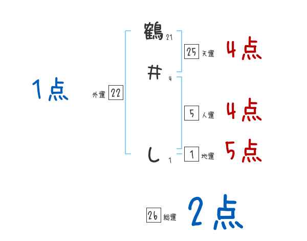 外運![]() | 鶴井しさんの外運は22画の1つ星!努力することが苦手ないっぽう手先が器用。芸術性にも優れる。 生活面を象徴する運勢です。外部から受ける影響力を表し、結婚運、家庭運や職場、環境への順応性を表します。 |