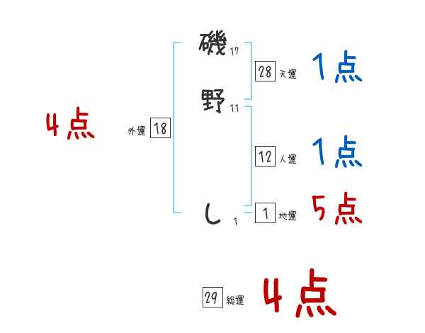 天運![]() | 磯野しさんの天運は28画の1つ星!家庭環境に注意。スポーツで活躍できる能力があるかも。 家系が持つ宿命的な運勢を表します。祖先から受け継いだ苗字ですので自分の力が及びません。家柄を象徴します。 |