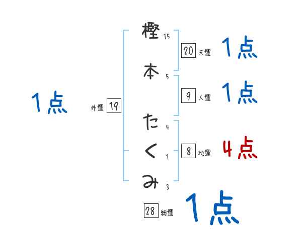 外運![]() | 樫本たくみさんの外運は19画の1つ星!優れた才能を持ちますが、協調性が足りないことも。周りの人と協力する事を意識しましょう。 生活面を象徴する運勢です。外部から受ける影響力を表し、結婚運、家庭運や職場、環境への順応性を表します。 |