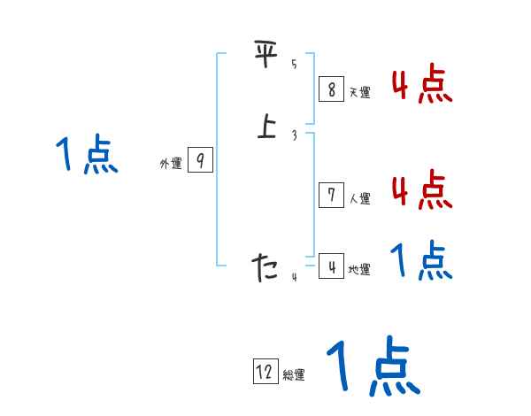 天運![]() | 平上たさんの天運は8画の4つ星!勤勉家。根気強く努力し成功する。忍耐力がある。 家系が持つ宿命的な運勢を表します。祖先から受け継いだ苗字ですので自分の力が及びません。家柄を象徴します。 |