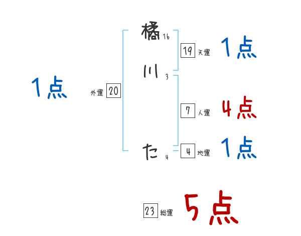天運![]() | 橘川たさんの天運は19画の1つ星!優れた才能を持ちますが、協調性が足りないことも。周りの人と協力する事を意識しましょう。 家系が持つ宿命的な運勢を表します。祖先から受け継いだ苗字ですので自分の力が及びません。家柄を象徴します。 |