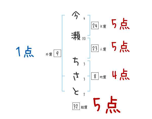 天運![]() | 今瀬ちさとさんの天運は24画の5つ星!家庭運が良く順調な人生。金運にも恵まれる。 家系が持つ宿命的な運勢を表します。祖先から受け継いだ苗字ですので自分の力が及びません。家柄を象徴します。 |