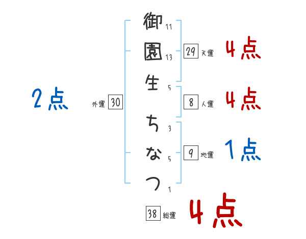 総運![]() | 御園生ちなつさんの総運は38画の4つ星!温厚な性格で技術的な才能を発揮する。職人的な仕事に向いている。 あなたの人生を表す1番重要な運勢です。生涯を通じて影響する総合運となり、主に50歳以降の晩年期に影響を及ぼします。 |