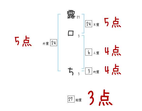 天運![]() | 露口ちさんの天運は24画の5つ星!家庭運が良く順調な人生。金運にも恵まれる。 家系が持つ宿命的な運勢を表します。祖先から受け継いだ苗字ですので自分の力が及びません。家柄を象徴します。 |