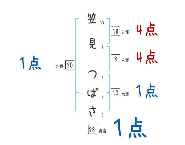 天運![]() | 笠見つばささんの天運は18画の4つ星!情熱的で剛気。忍耐力があり信頼される。 家系が持つ宿命的な運勢を表します。祖先から受け継いだ苗字ですので自分の力が及びません。家柄を象徴します。 |