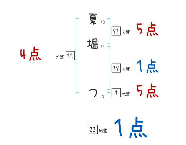総運![]() | 夏堀つさんの総運は22画の1つ星!努力することが苦手ないっぽう手先が器用。芸術性にも優れる。 あなたの人生を表す1番重要な運勢です。生涯を通じて影響する総合運となり、主に50歳以降の晩年期に影響を及ぼします。 |