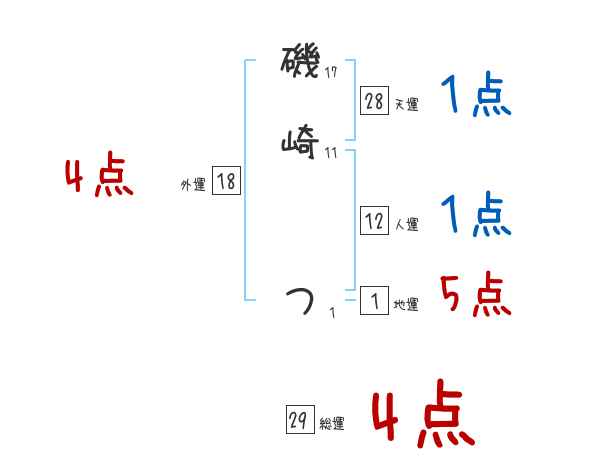 天運![]() | 磯崎つさんの天運は28画の1つ星!家庭環境に注意。スポーツで活躍できる能力があるかも。 家系が持つ宿命的な運勢を表します。祖先から受け継いだ苗字ですので自分の力が及びません。家柄を象徴します。 |