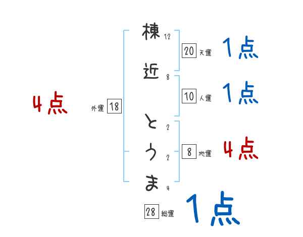 総運![]() | 棟近とうまさんの総運は28画の1つ星!家庭環境に注意。スポーツで活躍できる能力があるかも。 あなたの人生を表す1番重要な運勢です。生涯を通じて影響する総合運となり、主に50歳以降の晩年期に影響を及ぼします。 |