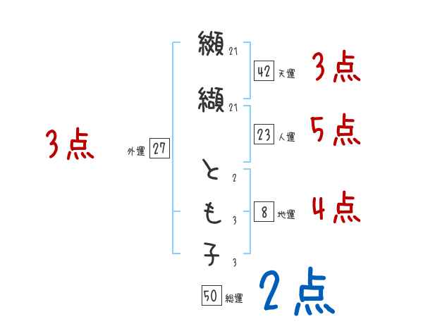 外運![]() | 纐纈とも子さんの外運は27画の3つ星!頭脳明晰だが強情で摩擦が多い傾向。孤立に注意。 生活面を象徴する運勢です。外部から受ける影響力を表し、結婚運、家庭運や職場、環境への順応性を表します。 |