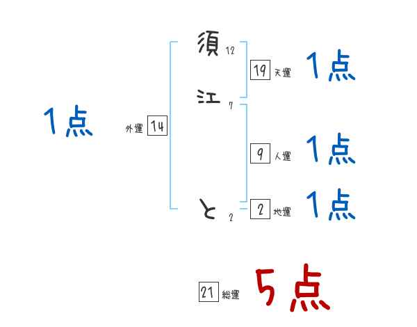 外運![]() | 須江とさんの外運は14画の1つ星!人に対して優しいがストレスを溜め込みがち。人間関係のトラブルを避けるよう気をつけましょう。 生活面を象徴する運勢です。外部から受ける影響力を表し、結婚運、家庭運や職場、環境への順応性を表します。 |